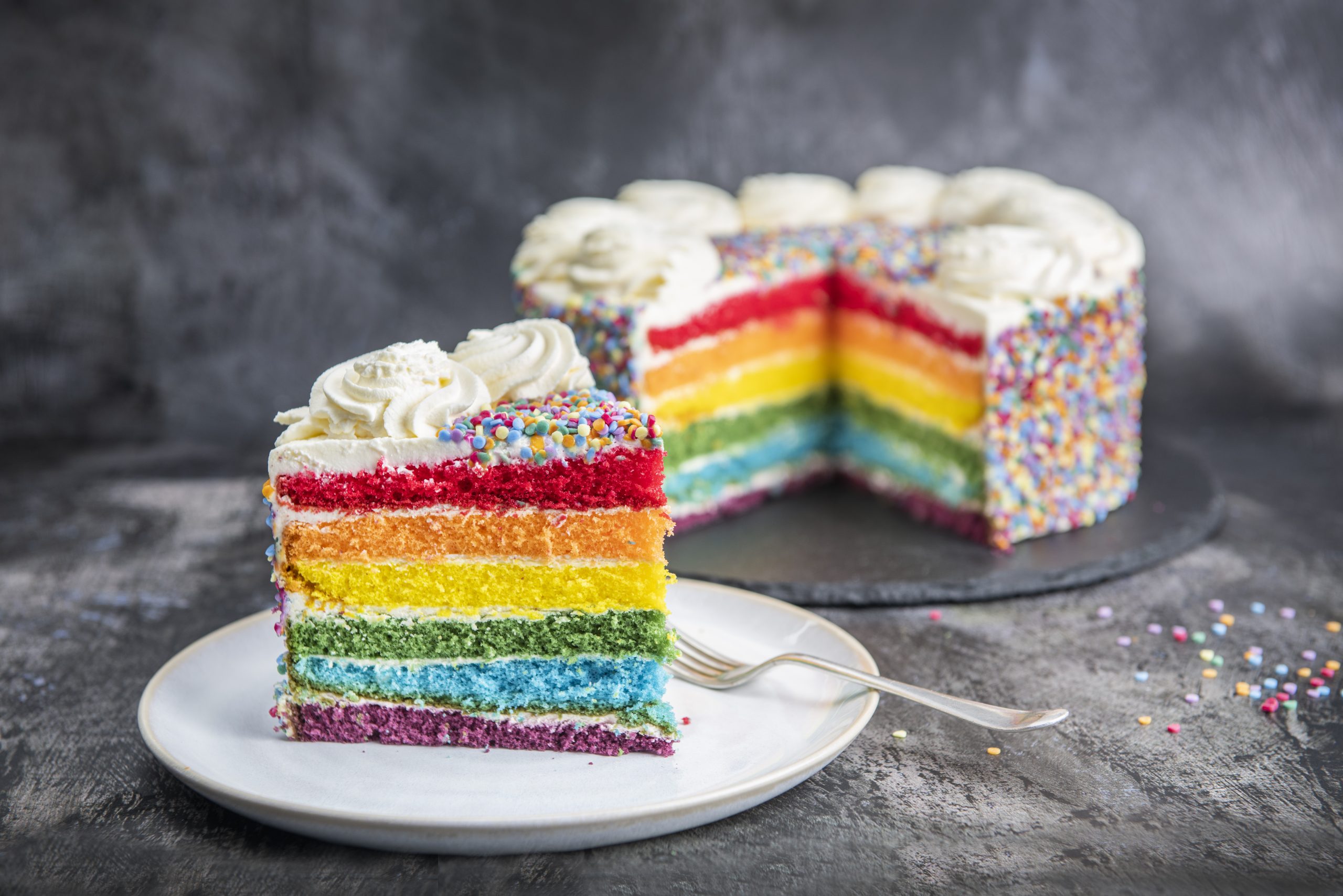 Six layers of rainbow coloured vanilla sponge simply layered with fresh whipped cream and covered with rainbow sequins. The perfect cake for the young and young at heart.