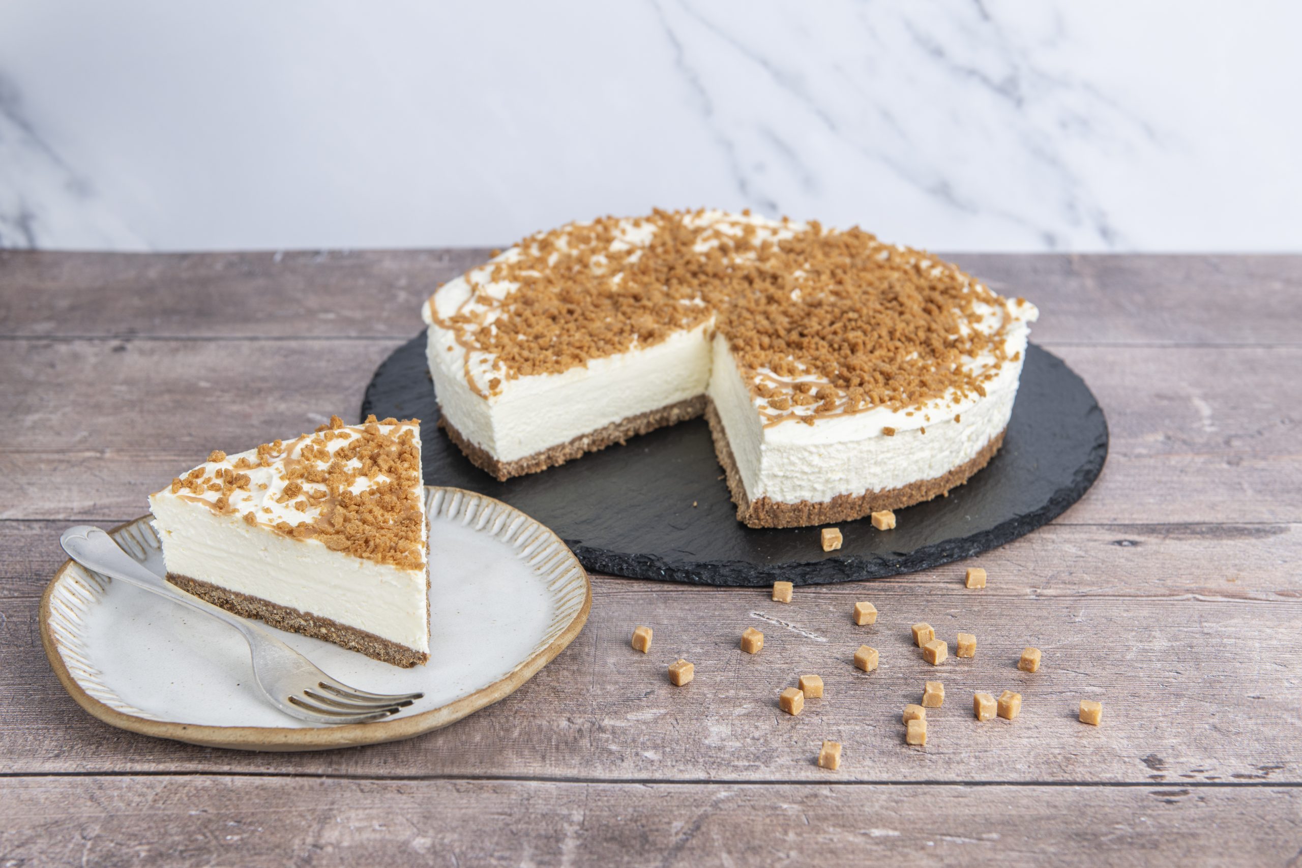 Light caramel cheesecake on a chocolate base. Finished with a rich salted caramel and crunchy speculoos crumb.
